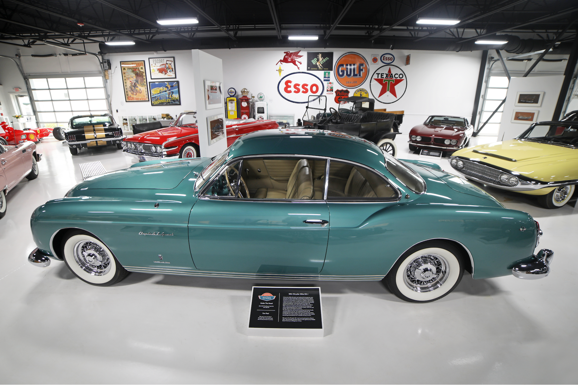 During the golden age of automotive design Americans were enthralled with European design. Car manufactures globally took notice and developed prototype and production model cars with European coach built bodies and American motors under the hood. This exhibit showcases two rare Chrysler Ghia prototype cars from the 1950s and stunning 1967 Iso Grifo with a small block Chrysler engine.